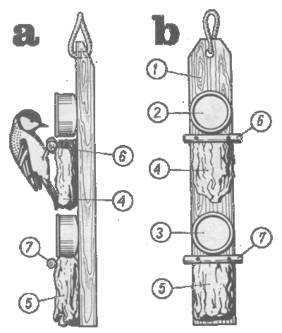 W ogrodzie lub na podwórzu można ustawić karmnik zbudowany według wzoru przedstawionego na rys. 3. Dwa kawałki cienkiej sklejki lub płyty pilśniowej 7 i 3 (rys. 3a) przybijamy gwoździkami do trójkątnej listewki 2. Grubsza deska 4 jest wsunięta pomiędzy ścianki i przybita gwoździami do dolnych krawędzi dachu 7 i 3. W środku deski 4 jest wywiercony otwór, który służy do zawieszenia karmnika na pionowym słupku 5 (rys. 3b). Cały karmnik daje się obracać dookoła słupka 5, co pozwoli nam na takie jego ustawienie, przy którym wiatr nie będzie wydmuchiwał wyłożonej na desce 4 karmy dla ptaków. Dodatkowo na obrzeżu deski 4 przybijamy okrągłe patyki lub gałązki 4a (rys. 3c).