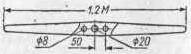 Dwułopatowe śmigło drewniane jest wykonane ze sklejonych desek sosnowych wg rys. 3 oraz pomocniczych wzorników przedstawionych na rys. 4. Prawidłowe wykonanie śmigła jest sprawą najtrudniejszą, jednak przy pewnej dozie umiejętności i staranności można je dobrze wykonać w sposób następujący.