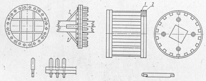 Rys. 8. Duże koło zębate (na lewo) i małe koło zębate (na prawo) przekładni wiatraka wiejskiegoNa tak wykonanym pierścieniu zaznacza się otwory do osadzenia w nim drewnianych palców, których długość przyjmuje się zwykle 1,5 raza większą od grubości. Palce te obtacza się na tokarce do kształtu pokazanego na rysunku i zaopatruje się w odpowiednie otwory, w które po osadzeniu palców w pierścieniu kołowym zabija się odpowiednie kliny. Wykonane w ten sposób koło osadza się na wale skrzydłowym i zaopatruje się w odpowiednie podpórki (1 na rys. 8).