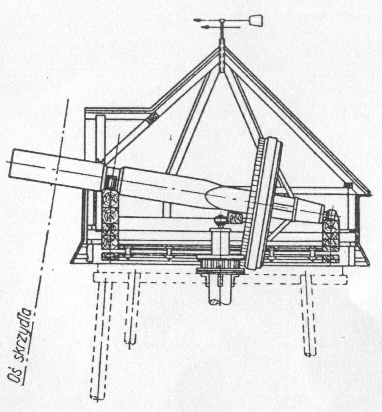 Rys. 10. Przekładnie w konstrukcji drewnianej: a) górna, b) dolna; c) rolkowa podstawa głowicy; d) schemat mechanizmu obrotu głowicy.Stosunek przełożenia górnej pary kół 1:3, dolnej pary 1:2,34. Całkowite przełożenie wynosi 1:7.