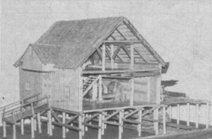 palach 1, pionowo wbitych w dno rzeki. Pale pod budynkiem ułożono
